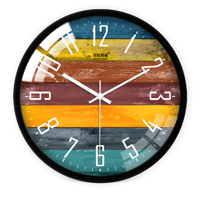 Verleihen Sie Ihrem Raum das gewisse Etwas mit dieser Bunten Wanduhr im Holzplanken-Design