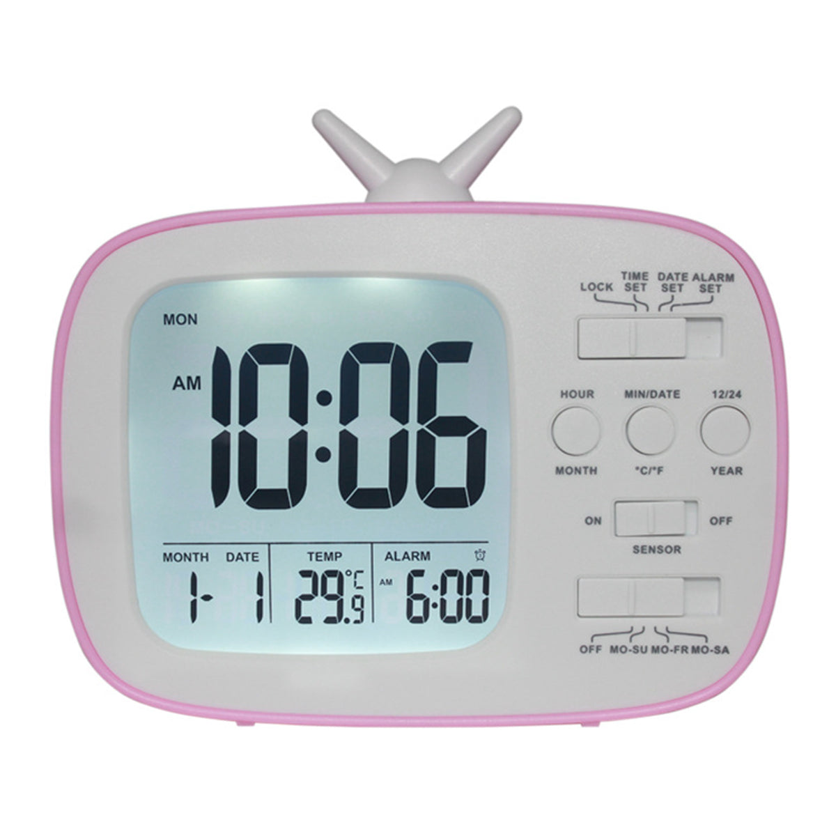 Alle Funktionen unseres Digitaler Wecker im Retro TV-Design auf einen Blick