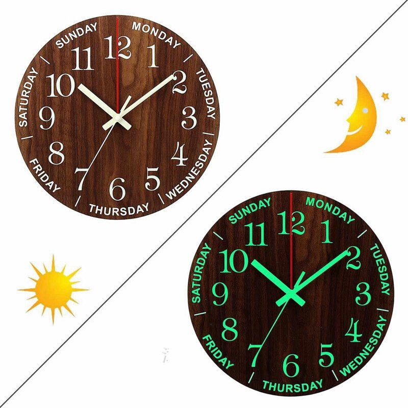 Kennen Sie das Gefühl, an einem arbeitsreichen Morgen oder einem entspannten Wochenende kurz den Überblick über den Wochentag zu verlieren? Mit unserer intelligenten Holz Wanduhr mit Wochentagen Design gehört das der Vergangenheit an! Die klar lesbaren Namen der Wochentage, die den Zifferblattkreis elegant umranden, bieten Ihnen stets eine schnelle Orientierung. Dies ist nicht nur praktisch für Ihren Alltag und hilft Ihnen, Termine besser zu planen, sondern auch eine wunderbare Hilfe für Kinder, die spielerisch die Wochentage lernen können, oder für ältere Menschen, die eine zusätzliche Gedächtnisstütze schätzen. Die nachleuchtenden Zeiger sorgen zudem dafür, dass Sie die Uhrzeit auch bei schlechten Lichtverhältnissen mühelos ablesen können, was den Komfort und die Benutzerfreundlichkeit dieser einzigartigen Uhr noch weiter erhöht und Ihnen Tag und Nacht zur Seite steht.
