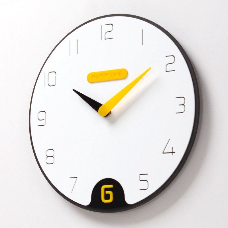 Diese Moderne skandinavische Design Wanduhr rund verkörpert die Prinzipien des skandinavischen Designs: Einfachheit, Funktionalität und eine tiefe Wertschätzung für visuelle Harmonie. Das strahlend weiße Zifferblatt, umrahmt von einem schlanken schwarzen Rand, bildet die perfekte Kulisse für die minimalistischen Stundenmarkierungen und die einzigartige, moderne Darstellung der Ziffern, besonders die stilisierten "11" und die markante "6" in einem schwarzen Halbkreis. Die kräftigen gelben Zeiger springen sofort ins Auge und machen das Ablesen der Zeit zu einem Kinderspiel, während sie gleichzeitig einen fröhlichen Farbtupfer setzen. Der charmante "HAPPY TIME" Schriftzug in Gelb verleiht der Uhr eine persönliche Note und erinnert Sie daran, jeden Moment zu genießen. Hier verschmelzen hochwertige Materialien mit einem durchdachten Design, um Ihnen nicht nur eine präzise Zeitmessung, sondern auch ein Kunstwerk für Ihre Wand zu bieten.
