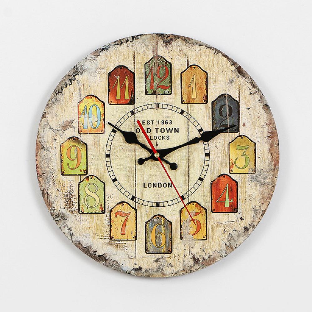 Diese wunderschöne Wanduhr besticht durch ihre authentische Holzoptik mit einem sorgfältig ausgearbeiteten Used-Look, der an alte, von Hand gefertigte Stücke erinnert. Der Rand der Uhr ahmt die natürliche, grobe Struktur von Baumrinde nach, was ihren Landhaus-Charakter zusätzlich unterstreicht. Die Stunden werden nicht durch gewöhnliche Zahlen, sondern durch individuell geformte, bunte Plaketten angezeigt, die wie kleine historische Wegweiser wirken und jedem Blick eine neue Entdeckung bieten. Im Zentrum des Zifferblatts zeugt die Inschrift "EST 1863 OLD TOWN LOCKS LONDON" von einer tief verwurzelten Geschichte und einem Hauch britischen Flairs, der dieser Uhr eine besondere Seele verleiht. Die schwarzen Zeiger, ergänzt durch einen markanten roten Sekundenzeiger, sorgen für eine klare Ablesbarkeit, während das präzise Uhrwerk dafür sorgt, dass Sie immer pünktlich sind.